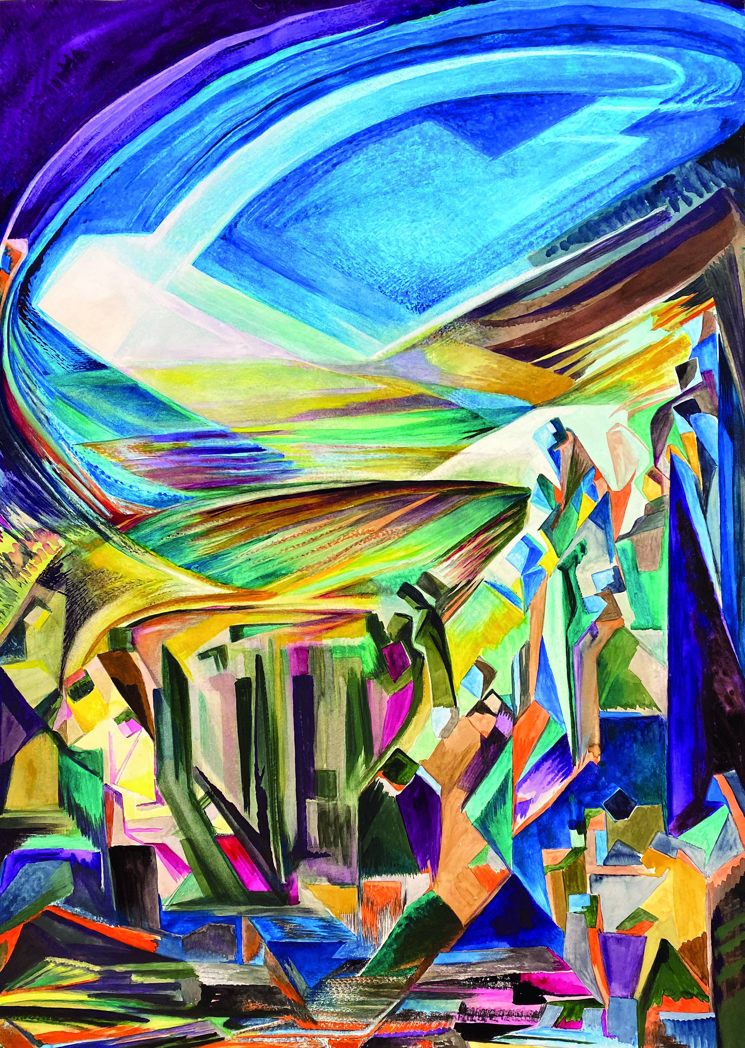 MARGARETE KUBICKA (1891-1984), eine Vertreterin des expressiven Kubismus, verstand ihre künstlerische Arbeit immer auch als politisches Wirken. So war sie gemeinsam mit ihrem deutsch-polnischen Ehemann, dem Maler Stanislaw Kubicki, 1918 Mitbegründerin der polnischen Expressionistengruppe BUNT (dt. Revolte) und veröffentlichte in Pfemferts Zeitschrift „Aktion“ Druckgrafiken und Gedichte. 1922 organisierte das Künstlerehepaar in Berlin die „Internationale Ausstellung revolutionärer Künstler“ mit. Nach 1933 beteiligte sich Margarete Kubicka aktiv am Kampf gegen das NS-Regime. Nach dem Krieg fand sie in ihrem künstlerischen Schaffen zu einer neuen Formensprache. Ihre farblich bestechenden Aquarellserien erzählen – häufig mit allegorischen und mythologischen Rückgriffen – von der erlebten Menschheitskrise. Hierfür stehen die großformatigen Bilder aus den Serien „Der Mensch erobert die Erde“ und „Vergangene, umstrittene, werdende Religionen“.