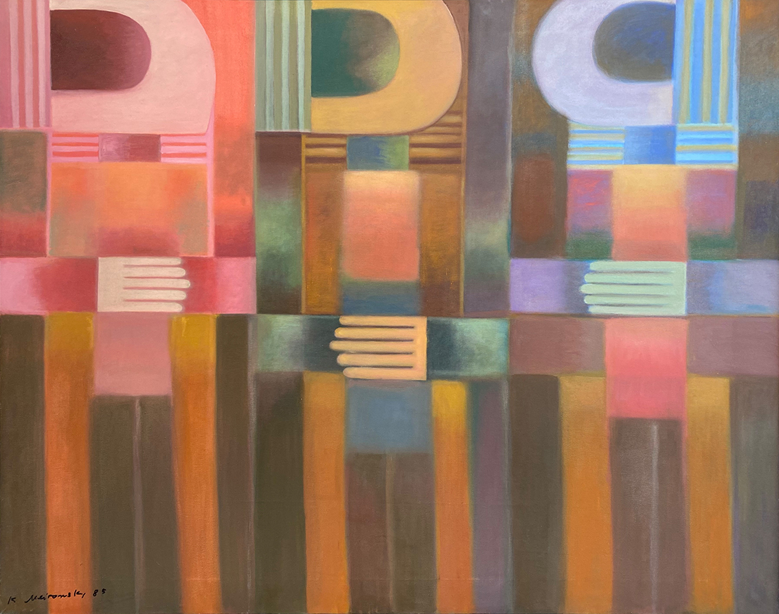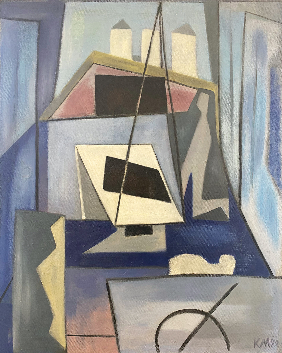 Nach ihren politischen und künstlerischen Erfahrungen in der Nachkriegszeit wählte Katja Meirowsky 1953 Ibiza zu ihrem neuen Lebensmittelpunkt. Hier öffnete sich ihr eine faszinierende Welt an neuen Motiven und Inspirationen. Die vielfältigen kreativen Impulse, die sie auf der Insel empfing, werden in Werken wie „Besinnung“ und „Jongleur“ deutlich. Die Grenze zwischen Abstraktion und Gegenständlichkeit verläuft in diesen Bildern fließend und sie vermögen trotz gedämpfter Farbigkeit zu leuchten.