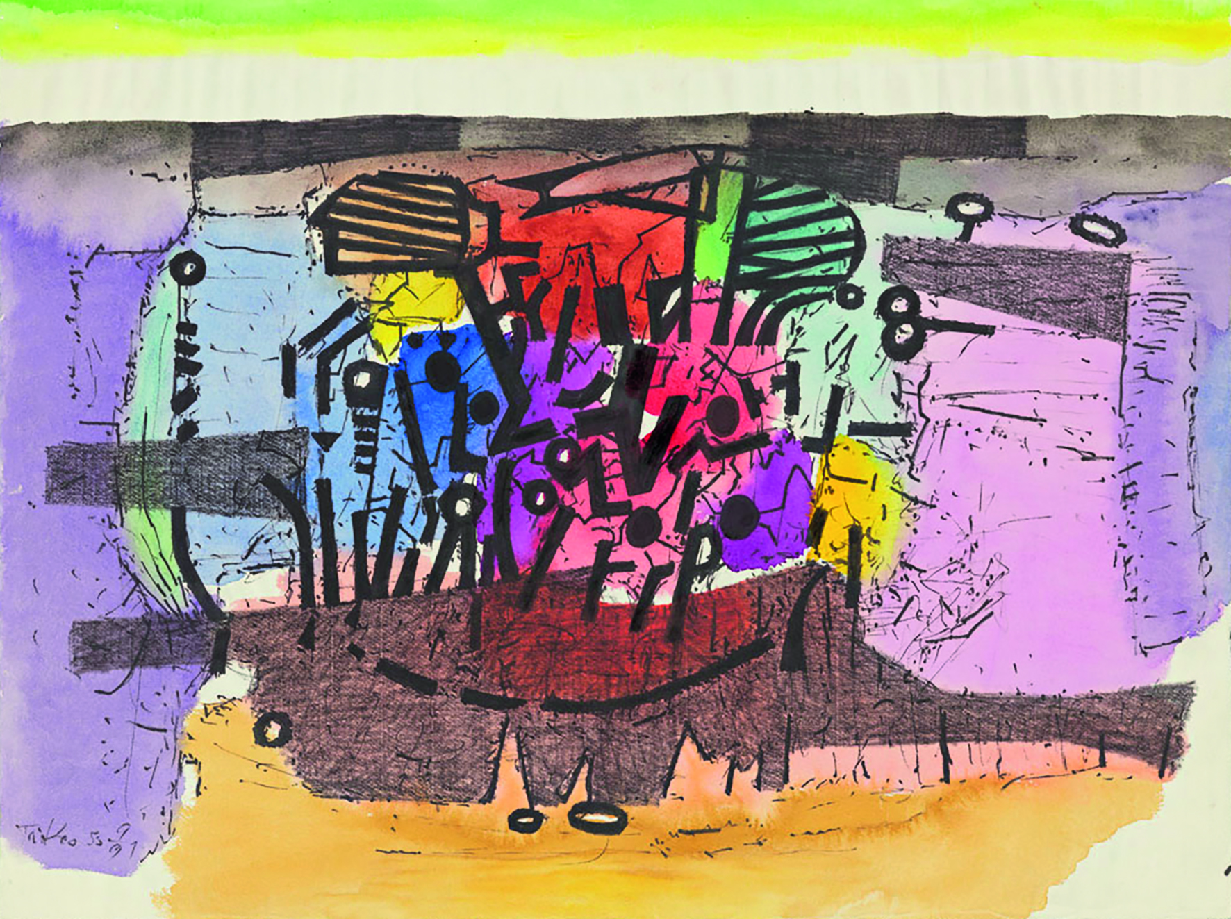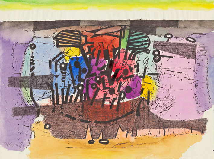 Als einzige Frau war Katja Meirowsky Mitglied der „Grupo Ibiza 59“. Der Vereinigung von Künstlern verschiedener Nationalitäten gehörte auch Heinz Trökes (1913-1997) an. Trökes und seine Frau hatten sich 1952 auf Ibiza niedergelassen. Wie schon in Berlin gehörten sie auch hier zu den Wegbegleitern von Katja Meirowsky, die 1953 mit ihrem Mann Carl auf die Insel kam. Im selben Jahr entstand Trökes’ Aquarell „Unter dem Horizont“, eine atmosphärisch-poetische Fantasie mit abstraktem Vokabular und leuchtenden Farben.