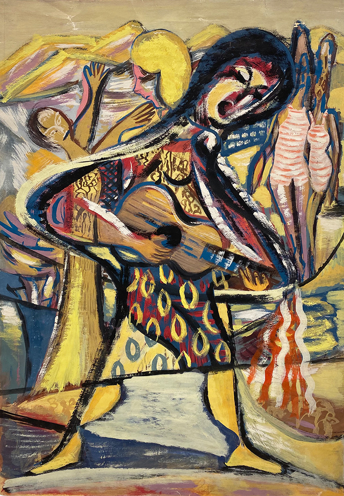 Das Schaffen von Fritz Kuhr (1899-1975) wurde entscheidend vom Bauhaus beeinflusst, an dem er von 1924 bis 1930 studierte und auch lehrte. Während des Nationalsozialismus trieb ihn die Abwertung seiner Kunst als „entartet“ in die innere Emigration. Nach dem Zweiten Weltkrieg nahm Kuhr seine künstlerische Arbeit und Ausstellungsbeteiligung wieder auf. 1948 berief Karl Hofer den Maler als Lehrer an die Hochschule für Bildende Künste Berlin. In Kuhrs Werken aus den frühen Nachkriegsjahren drückt sich seine wiedergewonnene Lebensfreude und unbändige Schaffenskraft aus. Mit schwungvollem und intuitiv geführtem Pinsel gemalt, werden auf seinen Bildern das hingebungsvoll interpretierte Gitarren-Solo, das jazzige Bass-Solo und das temperamentvolle Spiel einer Tanzkapelle gleichsam hörbar.