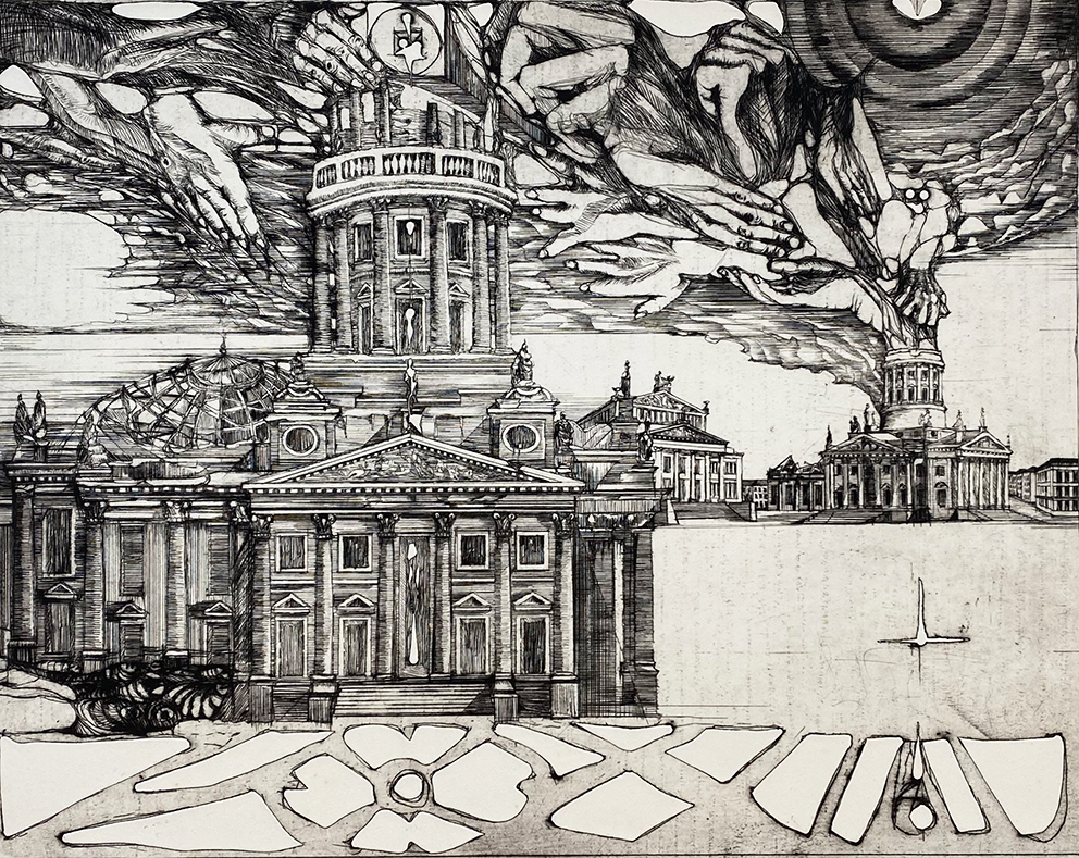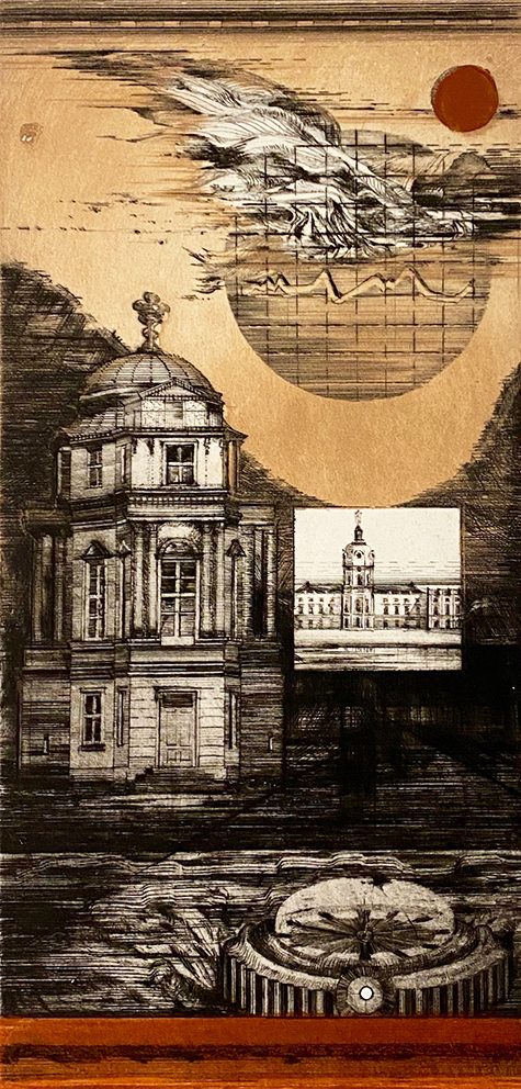 Der Berliner Maler und Grafiker Rolf Curt (1931-2006) entschied sich schon früh für die Malerei und die Druckgrafik als die beiden Hauptgebiete seiner künstlerischen Tätigkeit. In Radierungen arrangiert Curt bekannte Stadtansichten zu neuen visuellen Eindrücken. So bindet er markante Berliner Gebäude und Plätze in urbane Szenerien mit einer ebenso wirklichen wie unwirklichen Anmutung ein und fügt bisweilen anspielungsreich surreale Elemente hinzu. Mit dem Realen und Rätselhaften spielt der Künstler auch in seinen Gemälden aus den 1970er Jahren, die in der Ausstellung zu sehen sind. Die Welt wird in diesen Bildern zur Bühne, auf der Curt in perfekter altmeisterlicher Malweise Traum und Wirklichkeit, Unheimliches und Vertrautes ineinander verschränkt.