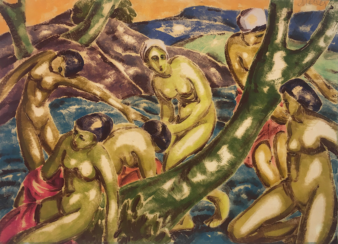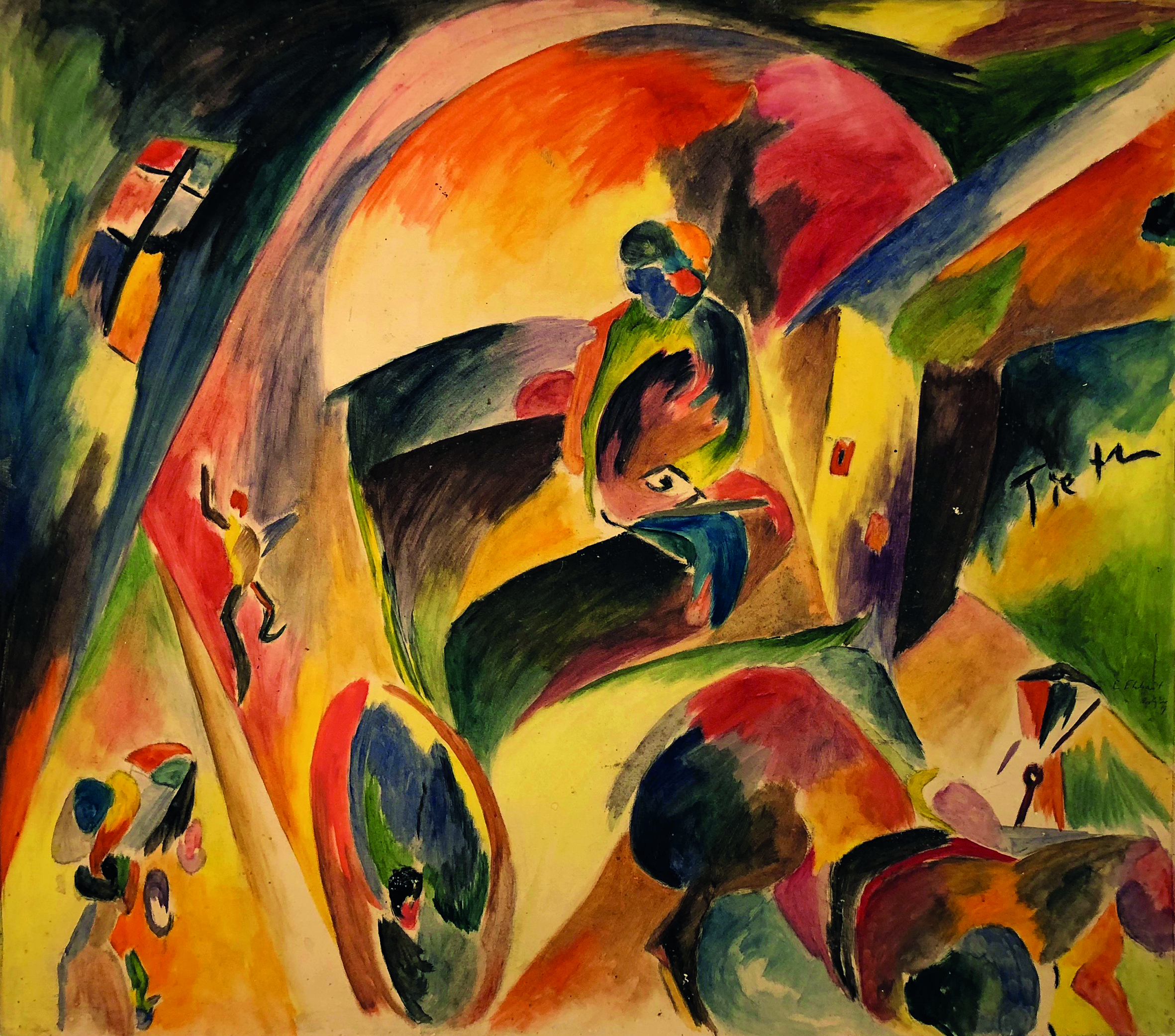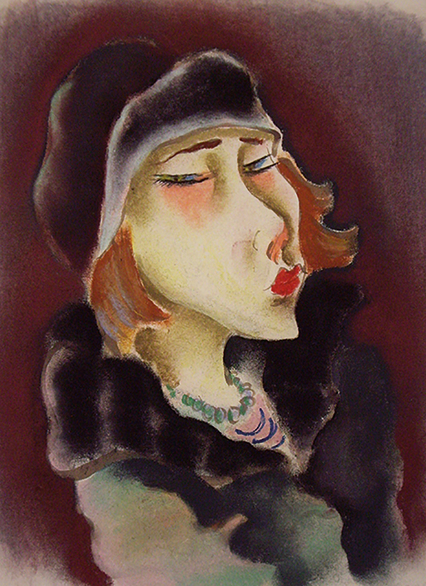 Das großformatige Gemälde „Berliner mit Weiße“ von Rudolf Ausleger eröffnet mit einem typischen Berlin-Motiv die Ausstellung. Das Bild, das sich bis vor kurzem noch in den USA befand, entstand 1925, vier Jahre nach dem Beitritt des Künstlers zur Novembergruppe. Ausleger war bis 1931 an nahezu jeder Ausstellung der Novembergruppe im In- und Ausland beteiligt. Wie die Bilder fast aller Mitglieder dieser Künstlervereinigung wurden auch seine Werke während des Nationalsozialismus als „entartet“ diffamiert. Auch Curt Ehrhardt wählte 1919 mit seinem „Droschkenkutscher bei Tietz“ ein Berlin-Thema. Der Künstler kam über den Sturm-Galeristen Herwarth Walden zu den Novembristen. Seine Gouache, die stilistisch unter dem Einfluss der vom Sturm-Kreis vermittelten avantgardistischen Strömungen steht, beeindruckt durch ihre Farbenfrische sowie die fast vollständige Auflösung des gegenständlichen Motivs. Großstadtatmosphäre spiegelt auch das Aquarell aus den 1920er Jahren von Cesar Klein wider. Er gestaltete jedoch kein einzelnes, unverwechselbares Motiv, sondern verdeutlicht in seinem Aquarell prägende Zeiterscheinungen wie das neue Frauenbild, die Begeisterung für Sport und Technik sowie das moderne Bauen in einer aufs Wesentliche reduzierten, fast symbolhaften Art und Weise. Das künstlerisches Interesse des Novembristen Richard Ziegler galt vor allem den Menschen der Großstadt, dem Zirkus und dem Kabarett. Ende der 1920er Jahre entstand eine Serie von Pastellen, die – frei von moralischem Urteil und oft mit einer Prise Humor – weibliche Erotik und Glamour effektreich in Szene setzt. In der Ausstellung ist aus dieser Zeit u.a. sein „Mädchen mit grauer Pelzkappe und grauem Pelzkragen“ zu sehen.