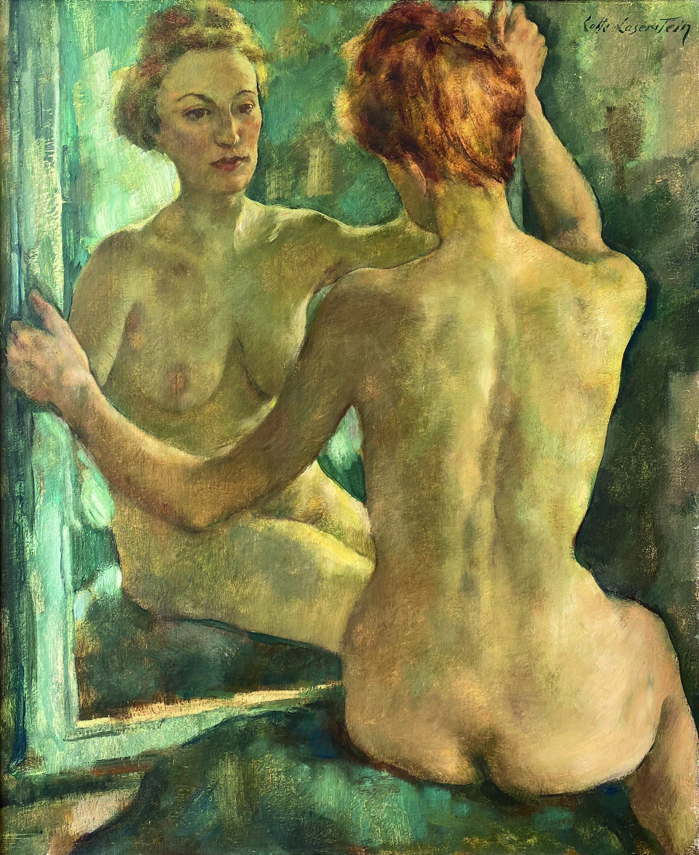 LOTTE LASERSTEIN (1898-1993) emigrierte 1937 nach Schweden, wo sie in den 1940er Jahren „Madeleine vor dem Spiegel“ malte. Der Halbakt zeigt Margarete Jaraczewsky, genannt Madeleine, Lasersteins wichtigstes Modell im Exil. Das Bild erinnert in seiner Anlage an das Gemälde „Vor dem Spiegel“ aus dem Jahr 1930/31, für das Lasersteins Berliner Freundin und enge Vertraute Traute Rose Modell saß. Die Kunsthistorikerin und Laserstein-Expertin Dr. Anna-Carola Krausse gibt in ihrer Expertise zu „Madeleine vor dem Spiegel“ folgende Einschätzung: „Ganz offensichtlich hat Laserstein die Arbeit selbst sehr geschätzt. In ihrem Nachlass, der Ende der 1990er Jahre in Privatbesitz gesichtet werden konnte, befand sich ein professionelles Werkfoto des Gemäldes. Derartige Aufnahmen ließ die Malerin regelmäßig von ihr bedeutendend erscheinenden Gemälden und Zeichnungen anfertigen.“