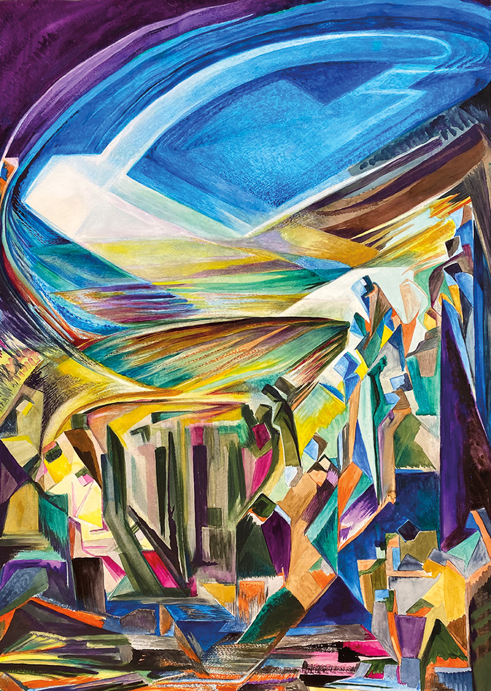 MARGARETE KUBICKA (1891-1984), eine Vertreterin des expressiven Kubismus, verstand ihre künstlerische Arbeit immer auch als politisches Wirken. So war sie gemeinsam mit ihrem deutsch-polnischen Ehemann, dem Maler Stanislaw Kubicki, 1918 Mitbegründerin der polnischen Expressionistengruppe BUNT (dt. Revolte) und veröffentlichte in Pfemferts Zeitschrift „Aktion“ Druckgrafiken und Gedichte. 1922 organisierte das Künstlerehepaar in Berlin die „Internationale Ausstellung revolutionärer Künstler“ mit. Nach 1933 beteiligte sich Margarete Kubicka aktiv am Kampf gegen das NS-Regime. Nach dem Krieg fand sie in ihrem künstlerischen Schaffen zu einer neuen Formensprache. Ihre farblich bestechenden Aquarellserien erzählen – häufig mit allegorischen und mythologischen Rückgriffen – von der erlebten Menschheitskrise. Hierfür stehen die großformatigen Bilder aus den Serien „Der Mensch erobert die Erde“ und „Vergangene, umstrittene, werdende Religionen“.