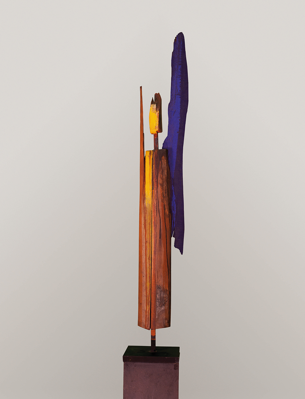Diese Darstellungen finden in der Ausstellung ein spannungsvolles Gegenüber in den archaisch anmutenden Skulpturen aus Holz. Der Künstler spielt hier mit Licht, Transparenz, Zwischenräumen und Rhythmus, wodurch ein wesentliches Merkmal seines Schaffens deutlich wird: Das Immaterielle ist von gleicher Bedeutung wie das Materielle. Dank dieser Balance strahlen seine Skulpturen eine stolze Ruhe und fast magische Kraft aus.