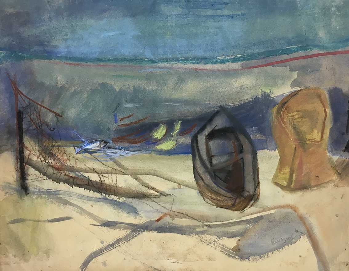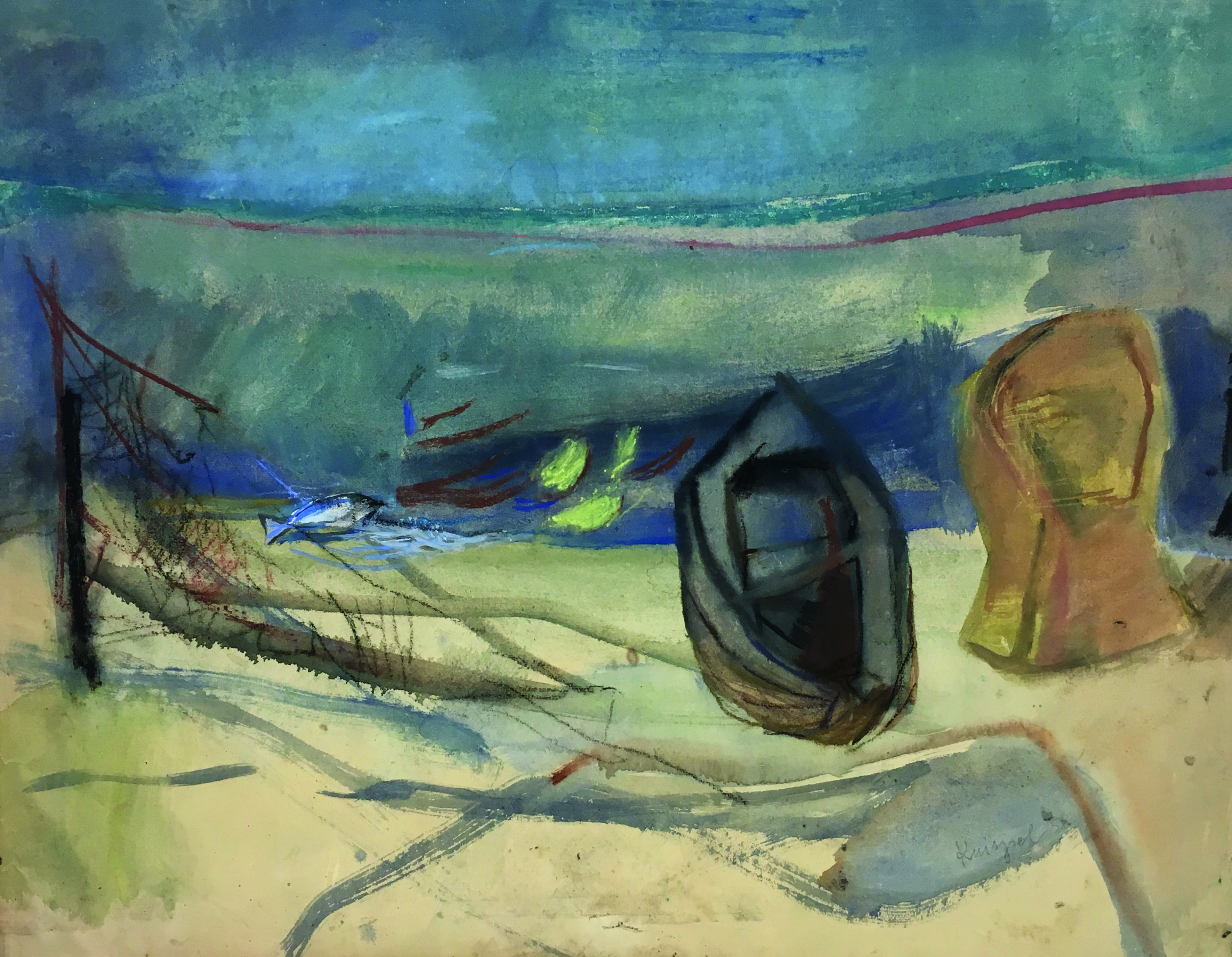Auch Hans Kinder verbrachte seit Ende der 1950er Jahre die Sommer regelmäßig in Ahrenshoop, wo er zu malerisch sensiblen Bildern von großer Formschönheit angeregt wurde. Bereits in der Gouache „Segel im Hafen“, die zu den frühen Arbeiten des Künstlers mit einem Ostsee-Motiv gehört, deutet sich an, was für das gesamte künstlerische Schaffen dieses Spätkubisten charakteristisch wird: die Darstellung von Bewegung, Simultanität und Transparenz auf der Fläche.